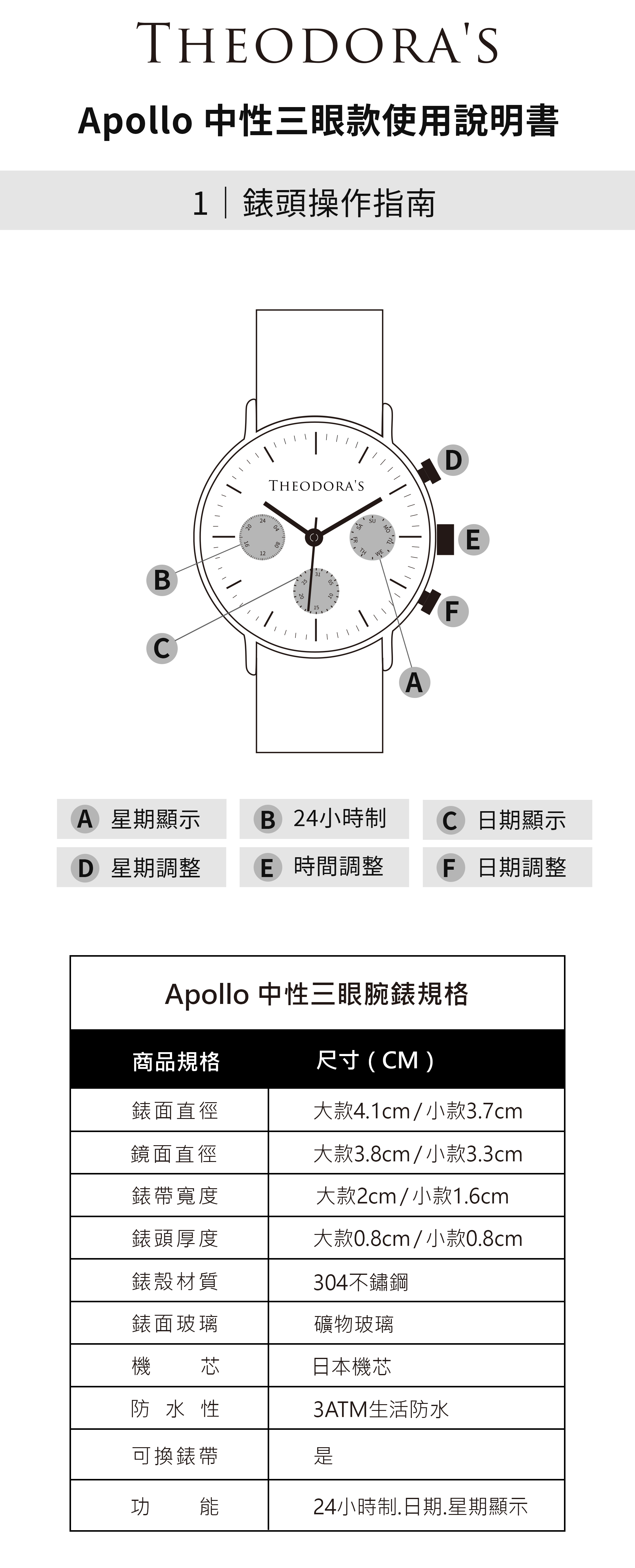 Apollo 中性三眼腕錶使用說明書