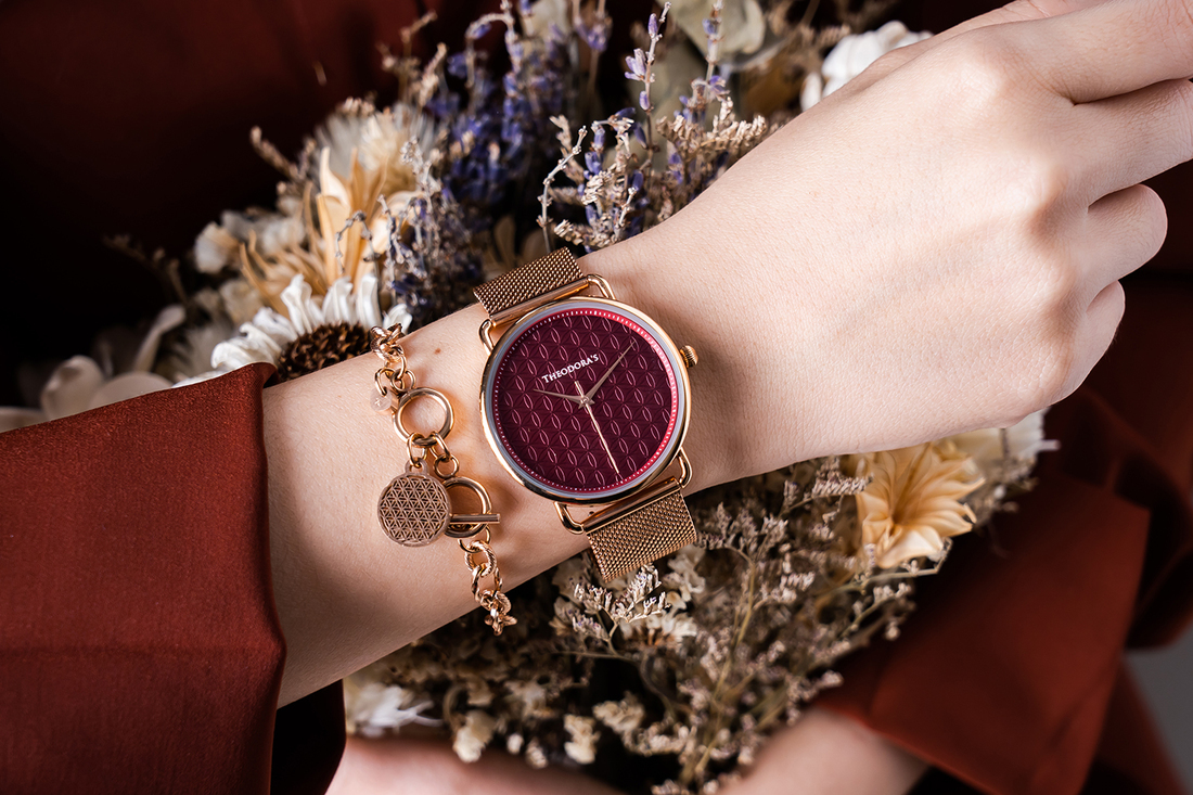 這款甦醒手鍊象徵所有希望的起點,收放的線條就像生命呼吸的瞬間,搭配一款咖啡紅手錶,典雅的時髦令人欣喜,讓人開始對世界也充滿期待。