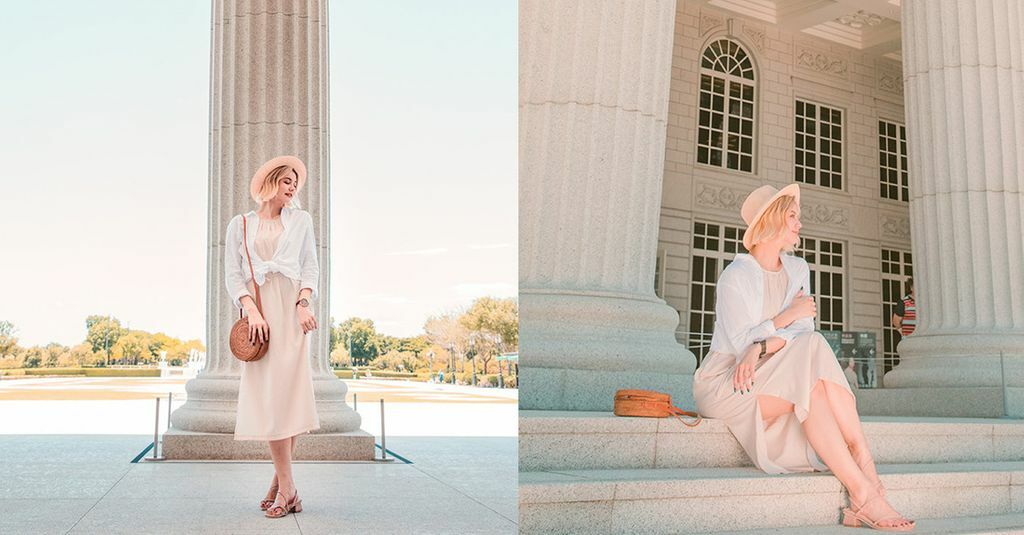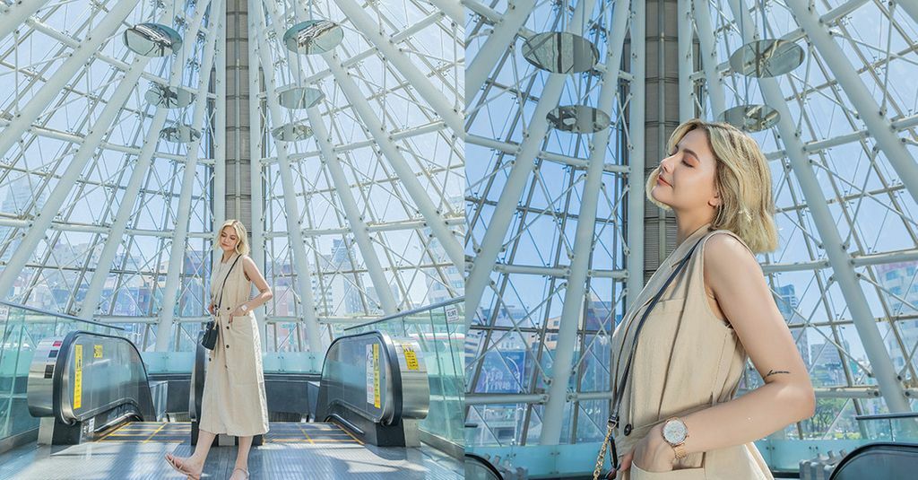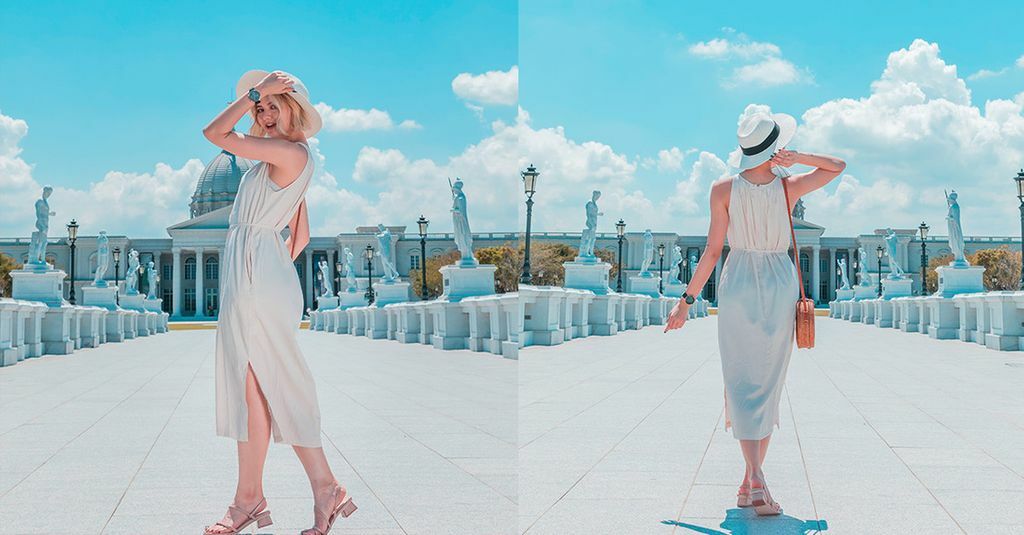 進到大廳,站在廊柱中間拍起來也超美,柔暖色調,搭配晴朗天空,畫面看起來愜意又迷人。