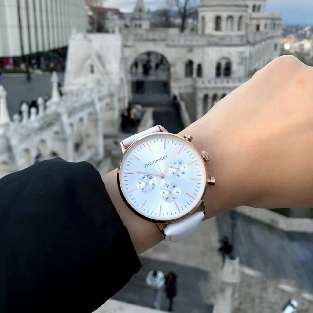 少見的純白色搭配,風格鮮明且時尚滿點,搭配歐洲城堡風景,隨手一拍,就是極致夢幻的美。(錶款連結)