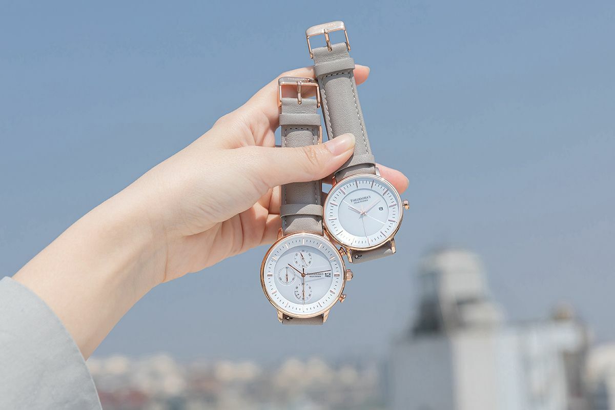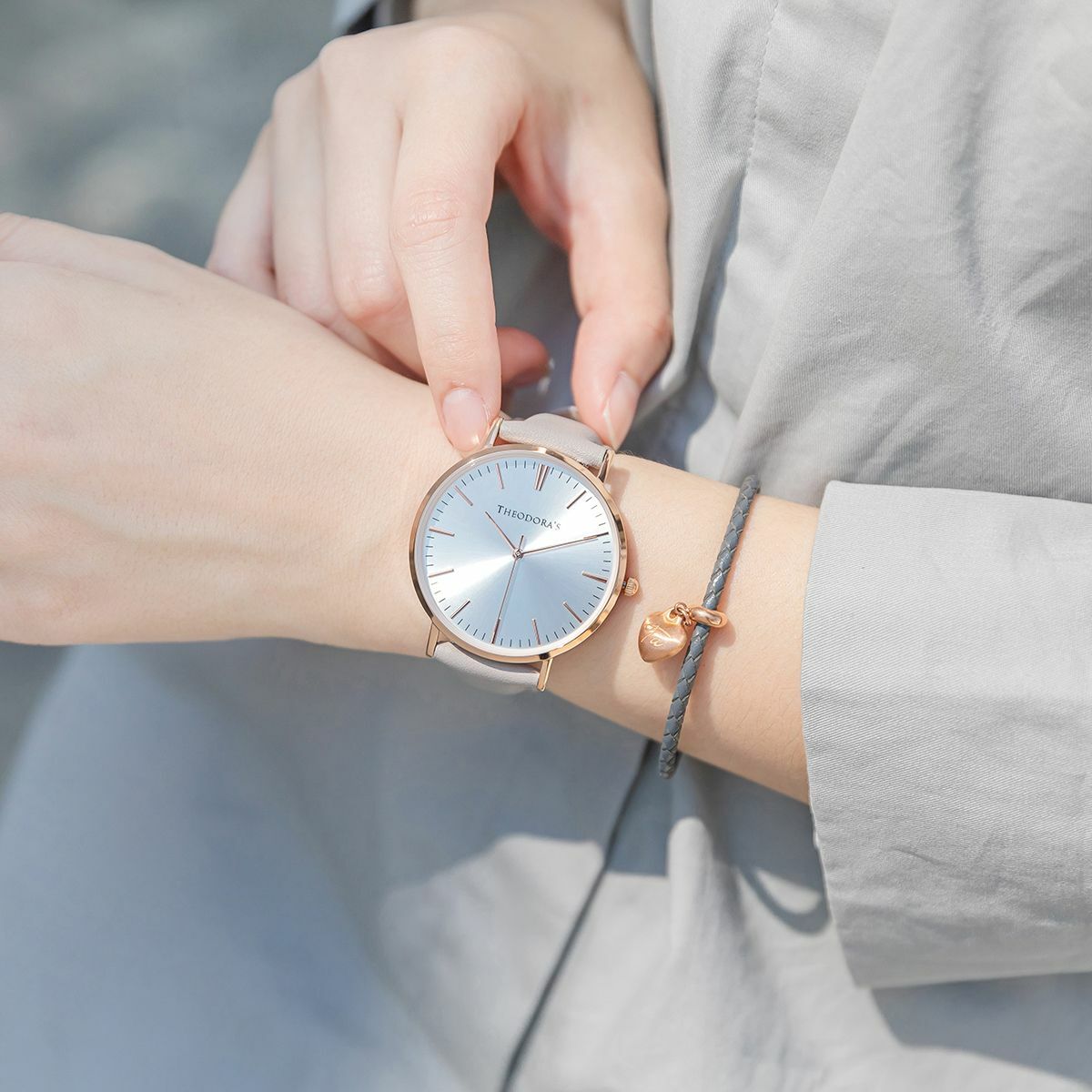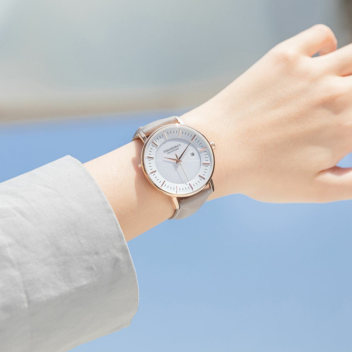 簡約錶面,加上淺灰色錶帶,就是簡單到爆炸的美。從裡到外透著純淨清新的氣息,乘著微風迎面而來,襯著藍天白雲的背景,甜美的鹽系單品,真的是超級好看!必收。