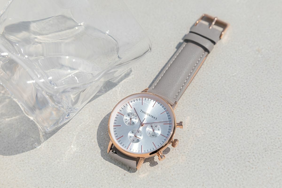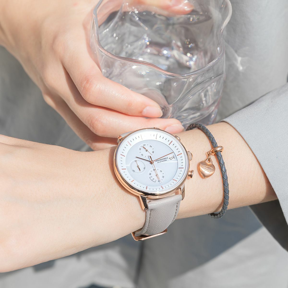 真三眼太陽能錶盤,加入灰色錶帶,調和了整支手錶的線條,沉穩中依然保有一抹溫柔。