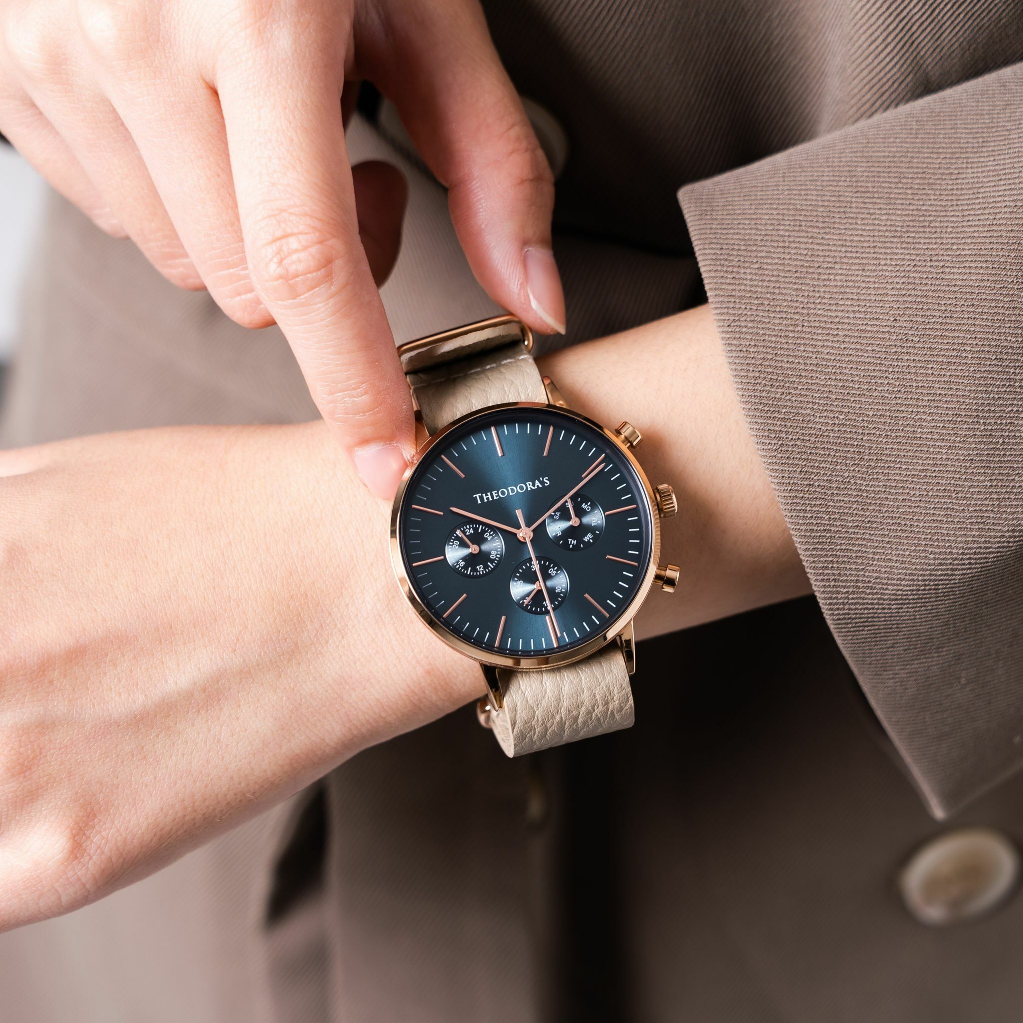 永遠不可錯過的人氣款式!就是Apollo真三眼湖水綠,這次搭配精品紋淺卡其錶帶,重新創造出湖水綠專屬的變奏美。