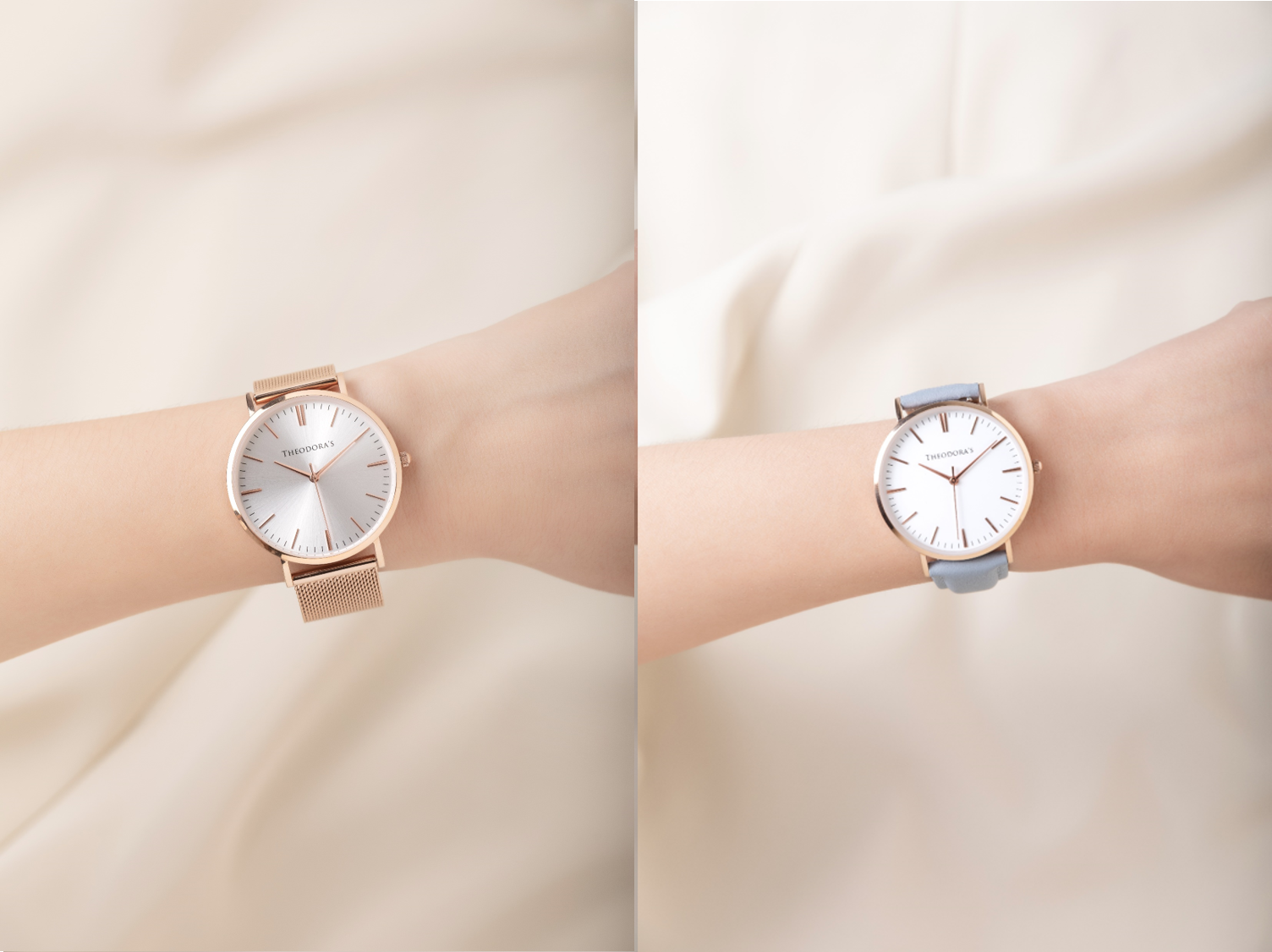 中性調的黃皮膚就是多數亞洲人的膚色,偏黃膚色如果身上的配件沒有挑選好,容易給人一種不夠健康的感覺,需要多花一些功夫來挑選,所以難度相對比較高。黑白兩色一定是最適合黃皮肌膚的,可以透過黑白兩色平衡肌膚的黃調,希奧朵拉的錶款多元,可以選擇黑色的錶帶,運用不同錶盤去達到不同的巧思。
