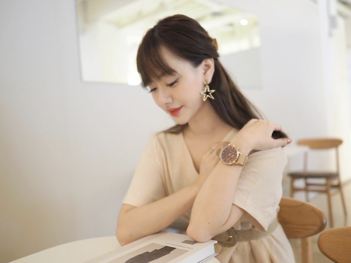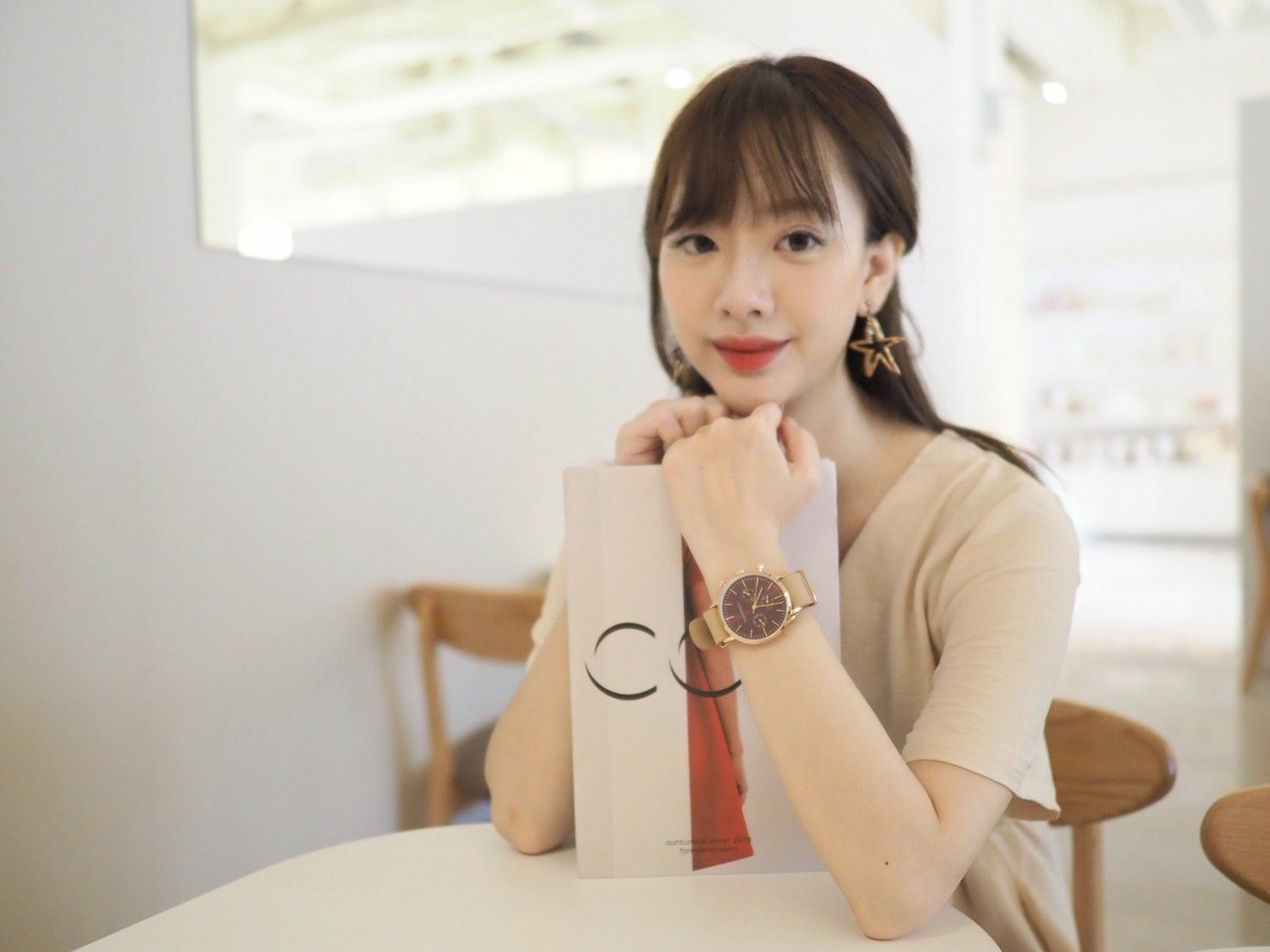 搭配瘋馬皮奶茶色,錶帶有點麂皮的觸感是瘋馬皮材質,非常輕盈不黏肌膚,大直徑錶面真的有種帥氣又時髦的感覺