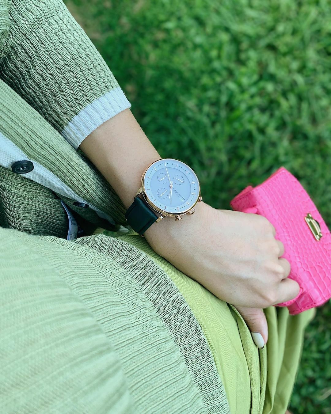 Mercury三眼真皮綠,墨綠色的真皮錶帶越看越耐看,同樣採用同色系穿搭,於手上有一個亮色系的配件點綴,富有巧思的搭配方式。