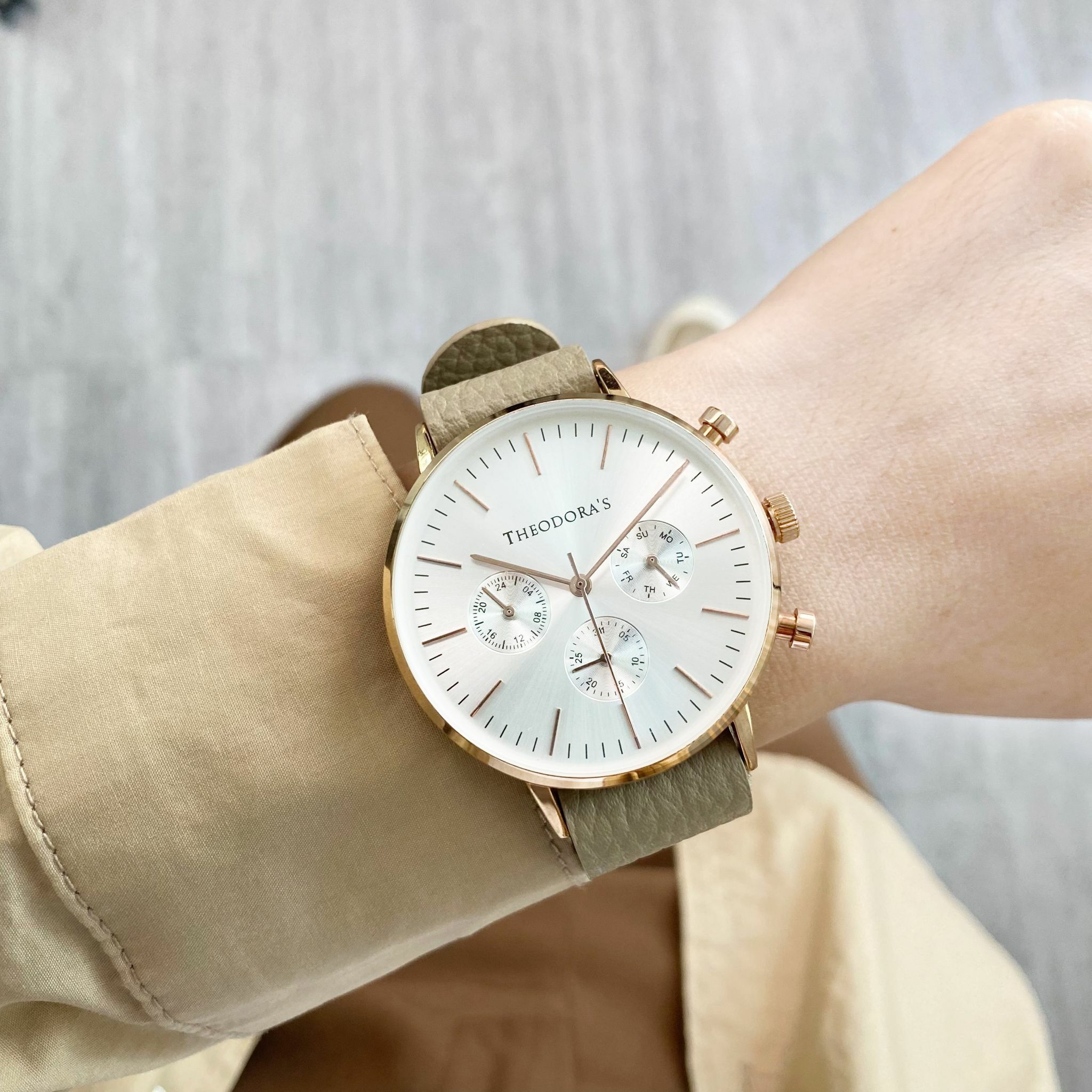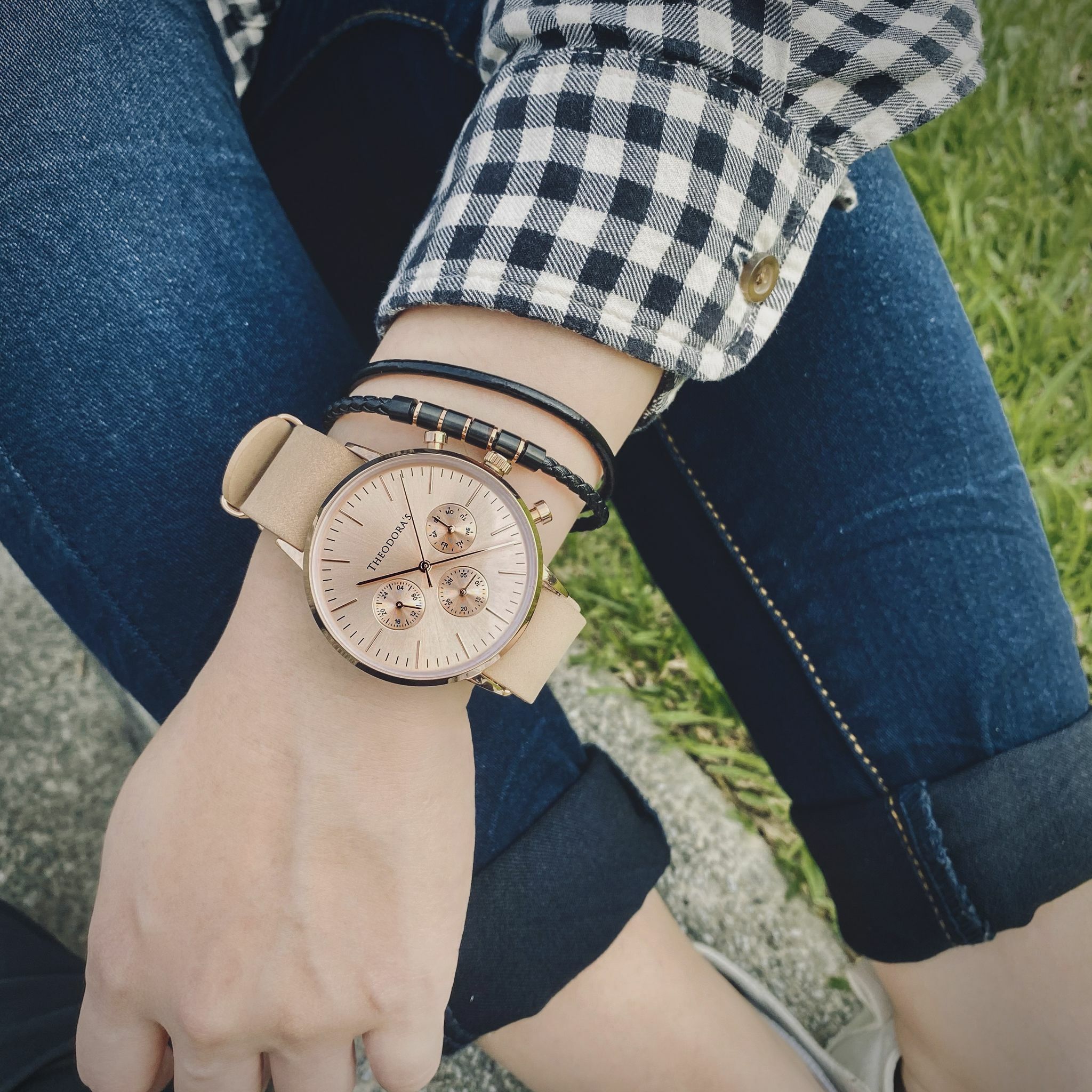 就用優雅氣質的玫瑰金開啟秋季吧!從錶盤到錶帶一致性的色系搭配,好搭配也相當襯膚色。