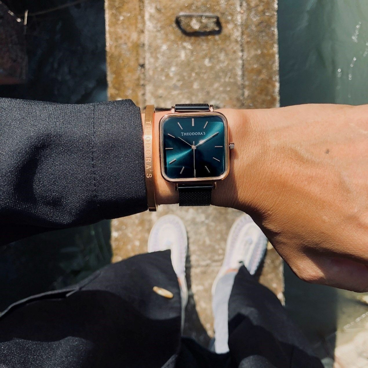 方型湖水綠錶盤搭配質感黑米蘭帶,無論什麼樣風格的穿搭,都帶給人一種沉穩內斂的神祕感。(手錶連結)