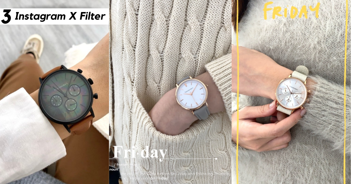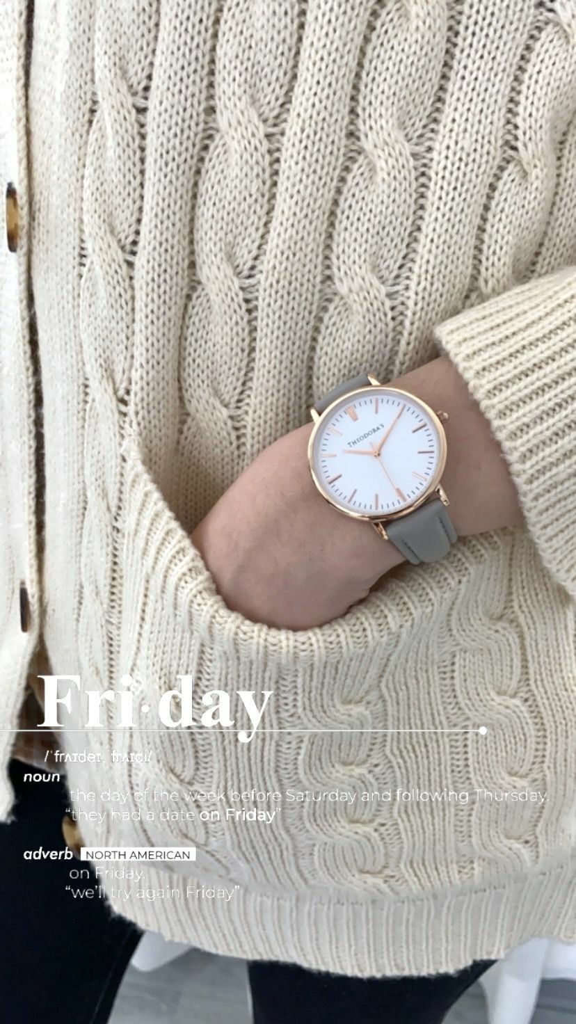 運用星期濾鏡來記錄旅行時的穿搭照片,也是一個不錯的選擇,這一款濾鏡將星期放置在左下角,文字中是富有小巧思的!將星期以名詞及形容詞作為註釋形,隨手一拍都有雜誌排版的高級感!實際拍攝全新上架的Hera真皮灰小錶面,搭配淺灰色真皮錶帶,輕輕柔柔的色彩,再搭配一件針織外套,不管是濾鏡或手錶適合清新風格的你。(商品連結)