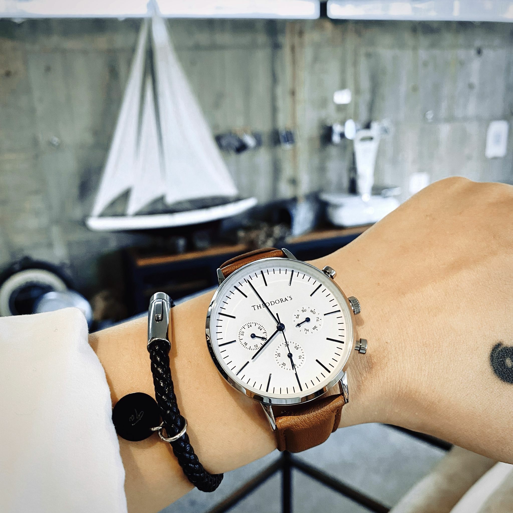除了深色的錶盤之外,白色錶盤搭配藍色指針作為撞色,可以讓整體穿搭更有活力朝氣,真三眼的功能錶具備24小時制、星期以及日期顯示,不僅外觀滿足穿搭需求,功能面也是一應具全。