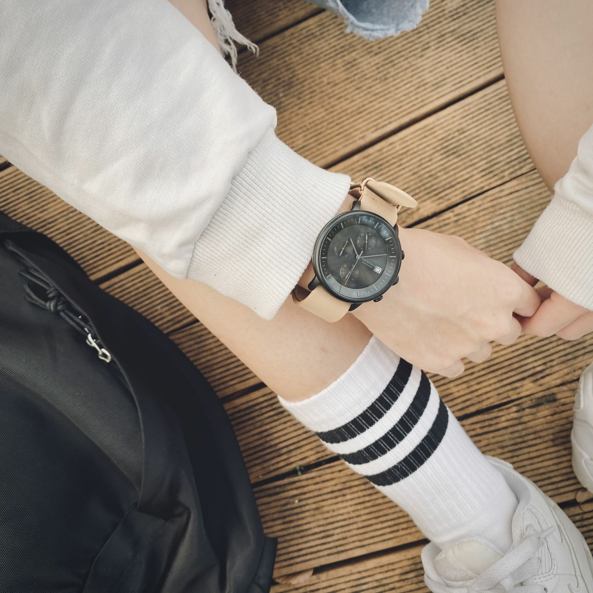 霧面黑色與奶茶色瘋馬皮錶帶形成了對比,深色錶盤與淺色錶帶搭配讓整體更有層次,更能凸顯不凡品味,三眼也更具功能性。(購買連結)