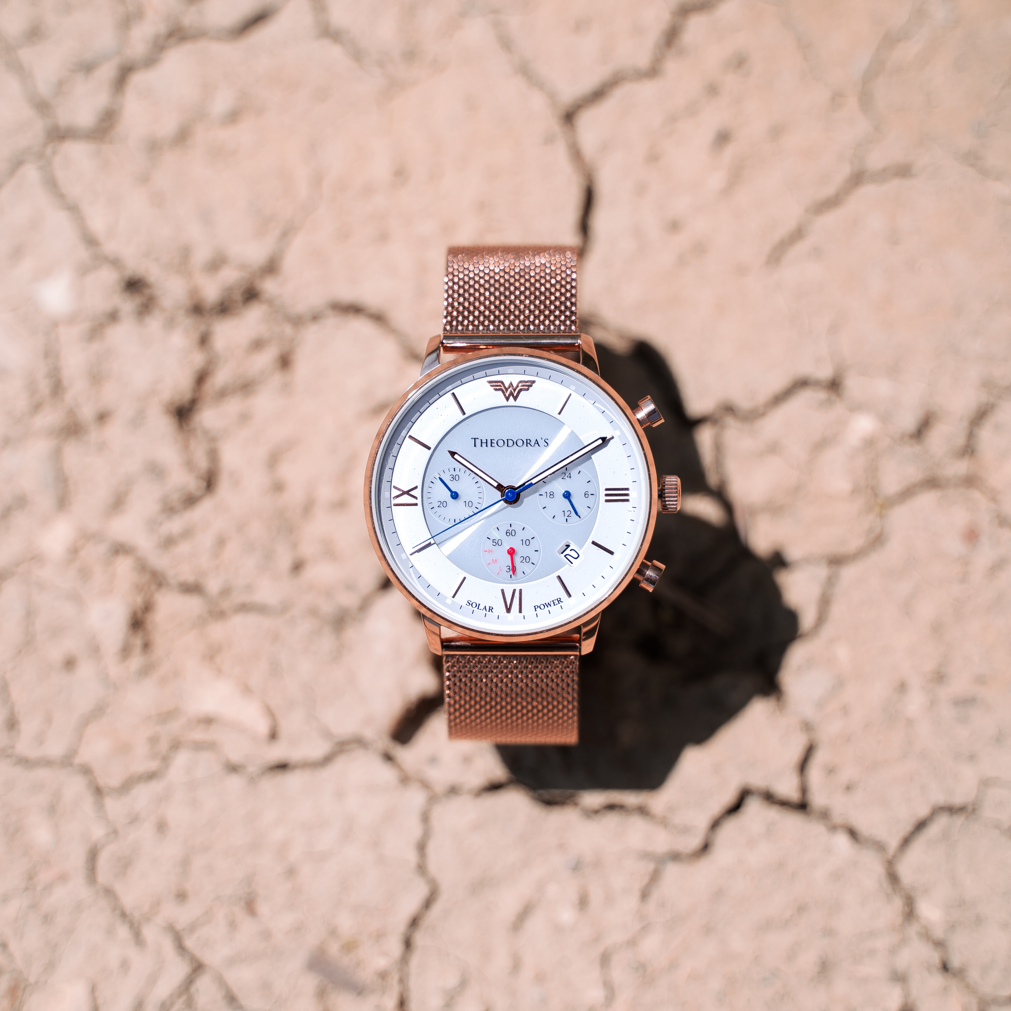 神力女超人太陽能腕錶,採用太陽能充電,好處是不用換電池,只要在有紫外線光源的地方照射,就能持續運轉。羅馬數字刻度、紅藍撞色小指針和W標誌,巧妙的呼應神力女超人的形象。
