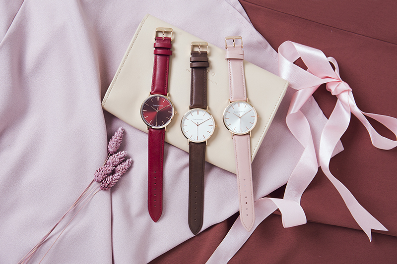 中間搭配棕色錶的錶面是蛋殼白,右邊搭粉紅帶的錶面是炫銀白,是不是很明顯看出差異了呢?