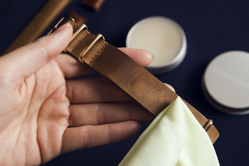 往同一方向輕輕的均勻塗抹於皮革錶帶上