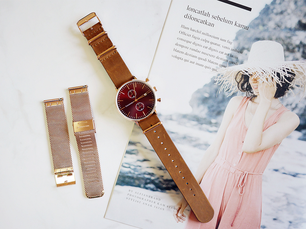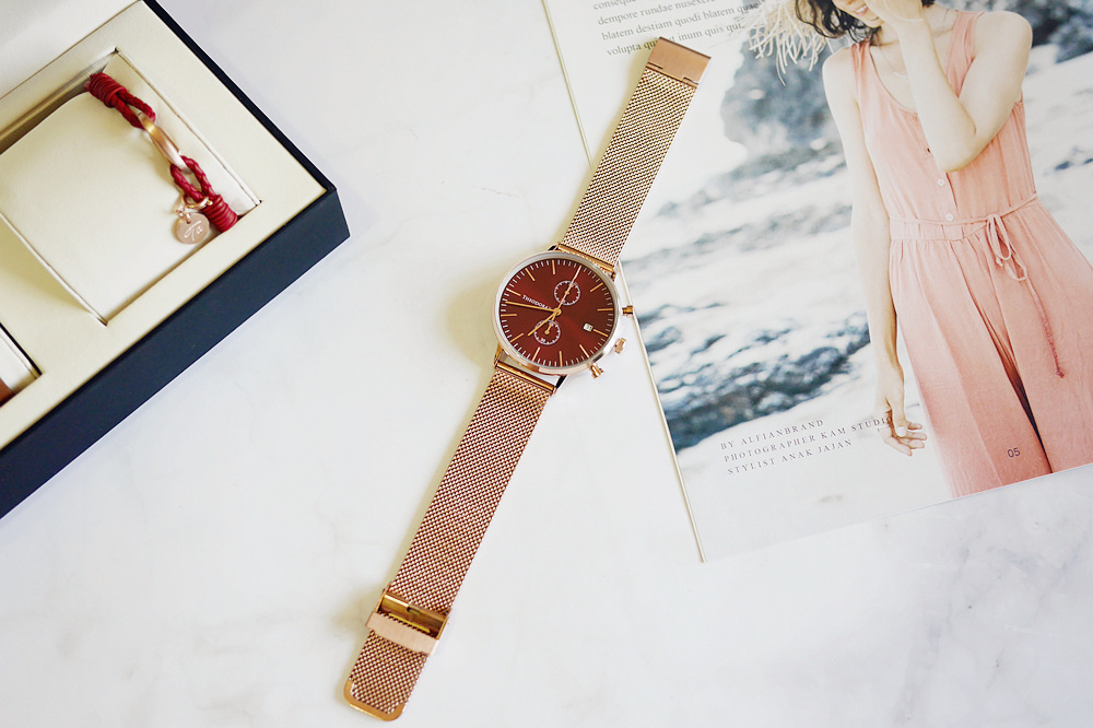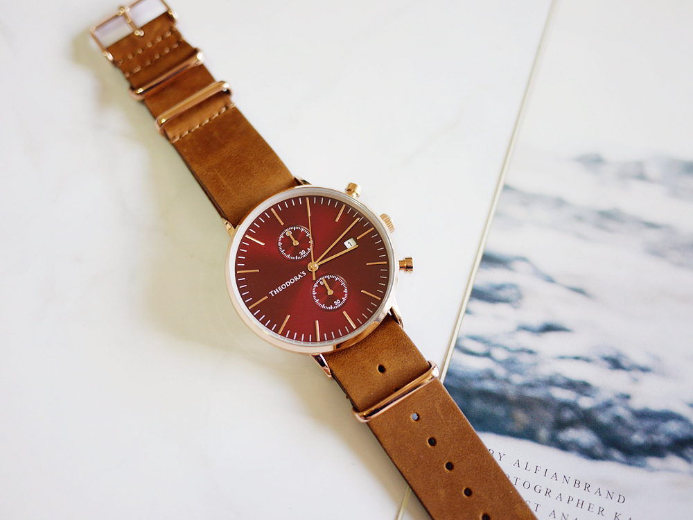 酒紅色的錶盤搭配玫瑰金的金屬錶帶一整個超美,