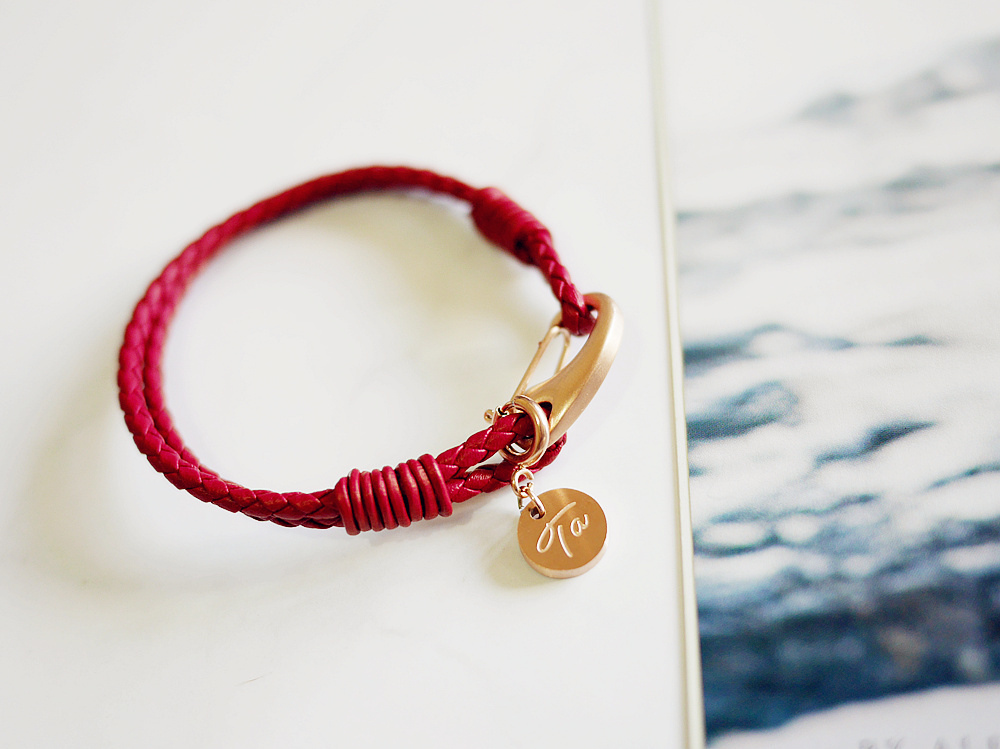 簡約的紅色編織皮手環,搭配一個金屬logo小吊牌,