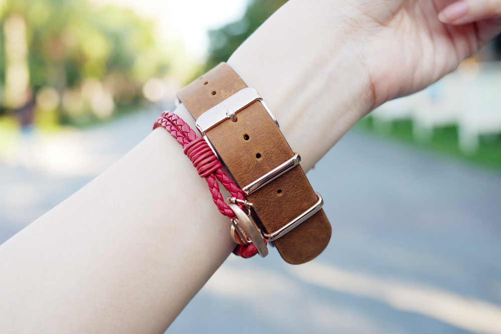 而且淺棕色皮錶帶跟這款紅色手環也好搭喔!