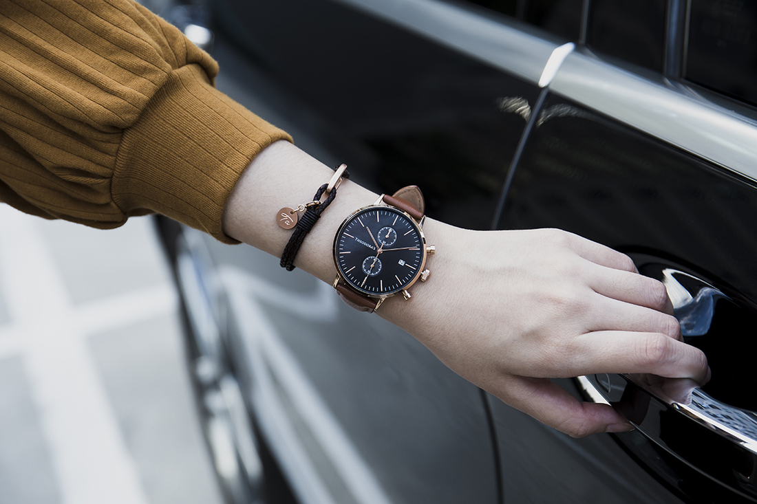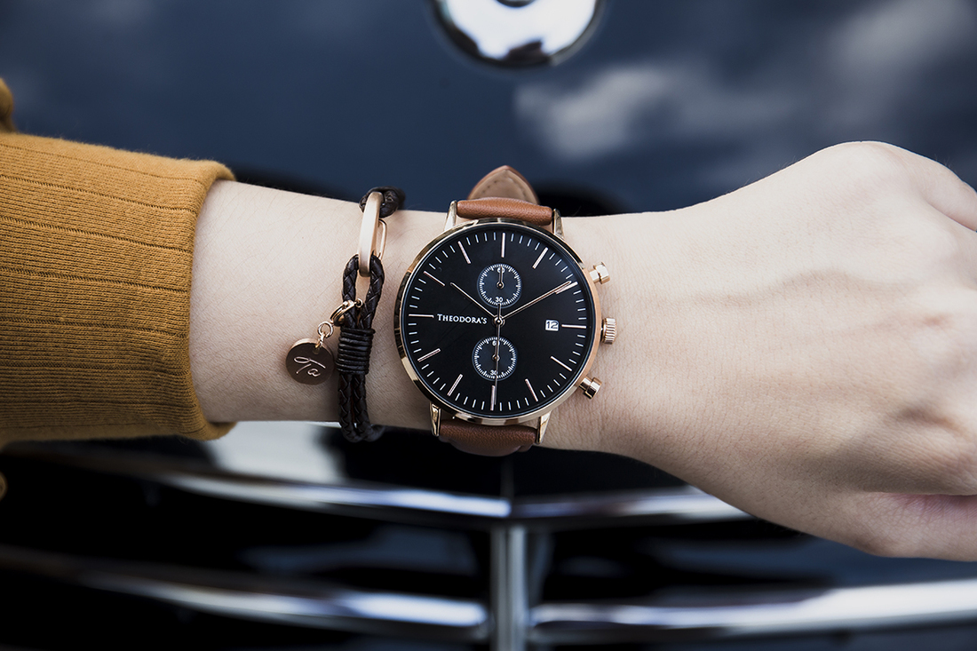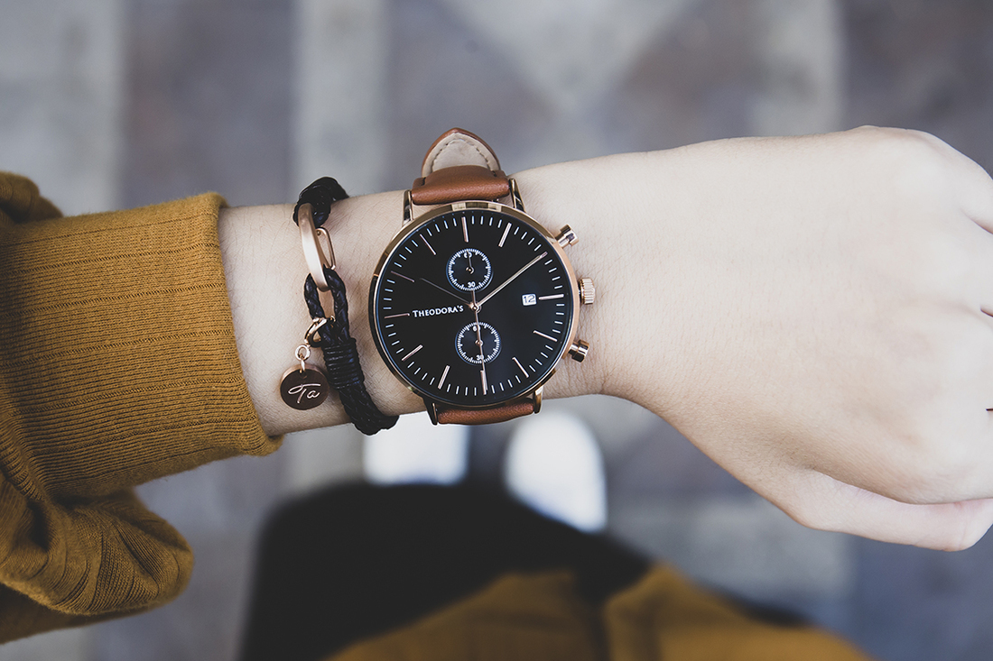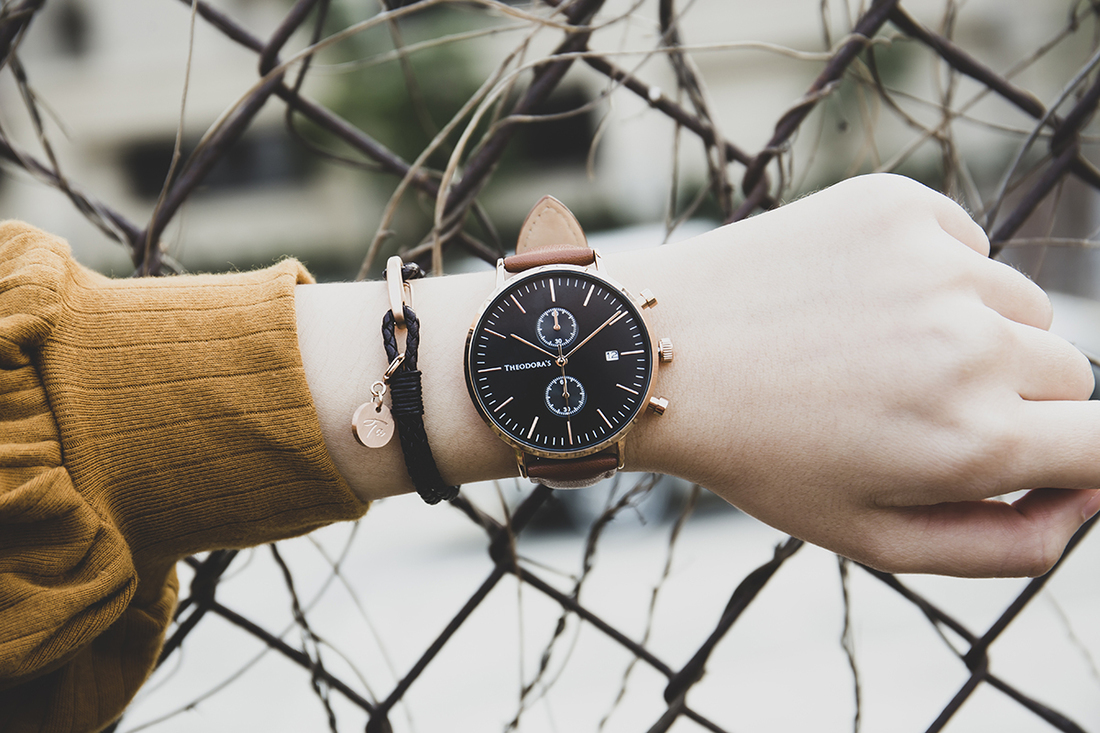 這款錶帶顏色是溫暖橘與焦糖棕的綜合,希奧朵拉官網上命名為「橘棕」。這是一款介於棕色與金黃色調之間,混和一點奶油質地的色彩,像是被陽光親吻的光澤,搭配黑色錶面,深邃又耀眼,配戴在手上十分顯白。